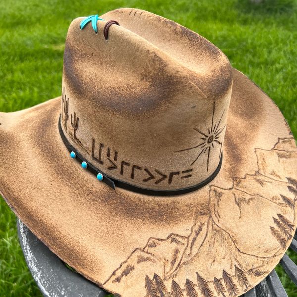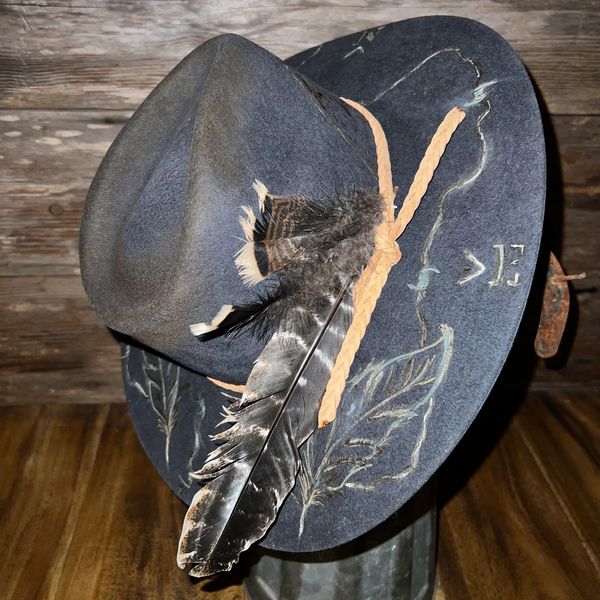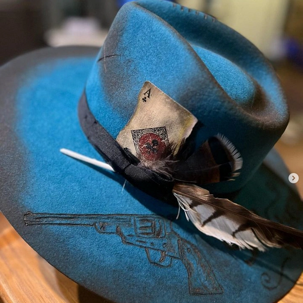 Personalize your hat with your own, one of a kind design. Choose flowers, mountains, feathers, longhorns, guns, a special quote… or ”all of the above”. This allows you to make your hat fit your own personality. We can even add your initials, so no one can claim your hat.